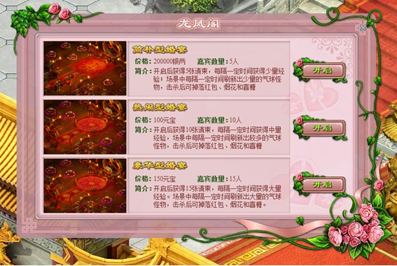 豪华型:开启后获得15张请柬,每隔一定时间获得大量经验。场景中每隔一定时间刷新出大量气球怪物,击杀后可掉落红包和喜糖。