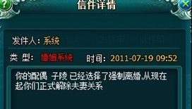 只需一方去月老处花费100000银两就可以解除双方关系,另一方将收到邮件提示。离婚以后的双方可以再次结婚或者和其他玩家申请结婚,只要双方满足结婚条件。