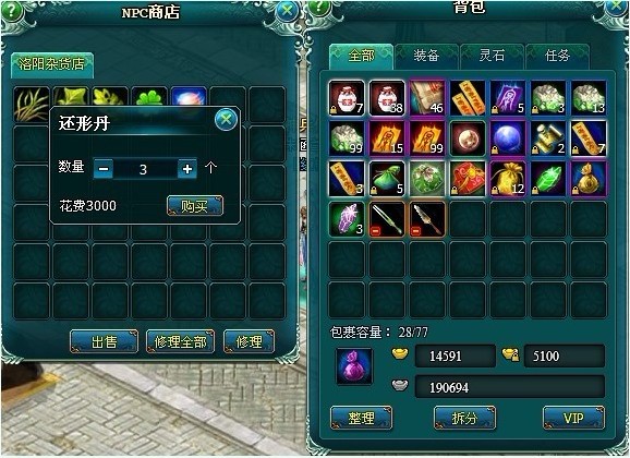卖东西:在背包中拉动需要卖出的物品到卖出窗口,点击确定出售,交易则完成;也可以用商店出售按钮,点出售按钮,鼠标焦点会变为出售焦点,只要点下要出售的物品,然后点击确定出售,一样可以完成交易。