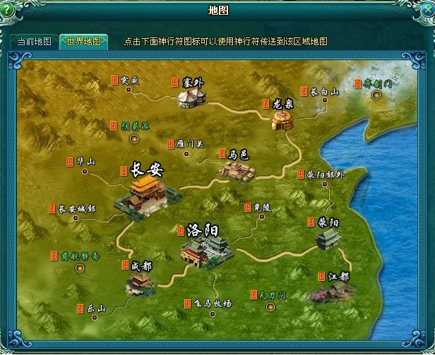 进入《大唐真龙贰》的游戏世界后,点击游戏界面右上角的“地图”按钮,就可以打开游戏的世界地图。