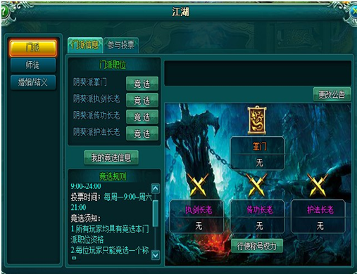 1、玩家可以对非本人的任意玩家投票,投票消耗道具门派令,投票成功后会获得竞选者设定的支持奖励。