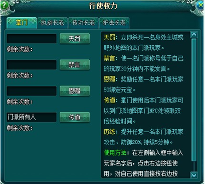 2、禁言:使一名玩家30分钟内不能在门派频道发言,每天两次;