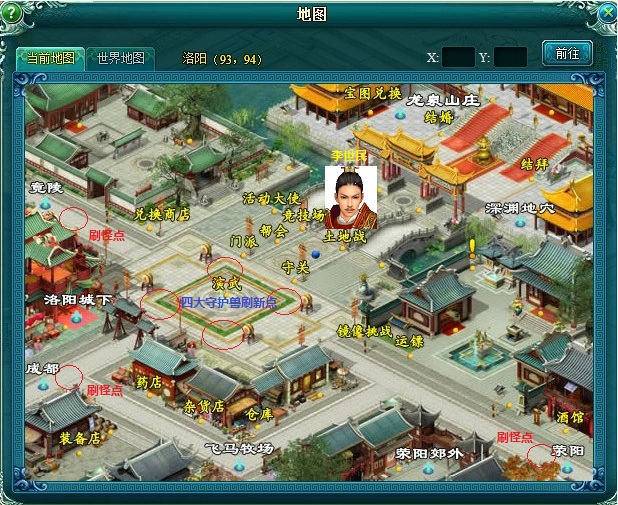 活动开始后,在洛阳演武区四角刷新四大守护兽:青龙、白虎、朱雀、玄武,全服广播活动开始,屏幕中央弹出浮动按钮,点击进去洛阳,参加活动。
