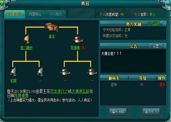 阵营官职每日轮替一次,以当日19点阵营内的帮会及战斗力排行榜为准,点击阵营或者士气条可以查看阵营官职等。阵营领袖轮替后,原有任免的亲卫不作变化,直至新领袖重新任免,此前未行使的特权与福利作废。