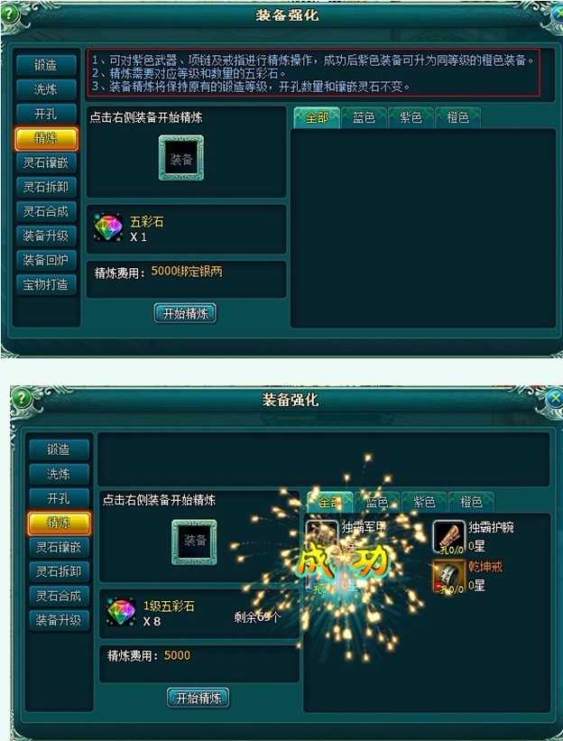 装备精炼,只能精炼紫色武器、项链和戒指,精炼可是非常值得的,精炼需要五彩石,只有拥有五彩石才能够进行精炼操作,不同等级的武器需要的五彩石也不同,精炼后装备由紫色变为橙色,品质更进一步,属性大大提升。