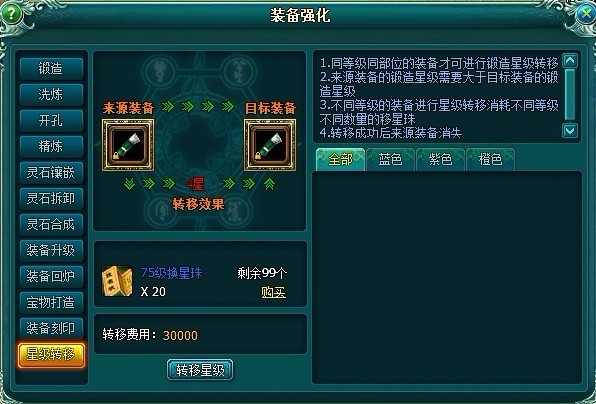 3、不同等级的装备进行星级转移,消耗不同等级不同数量的移星珠