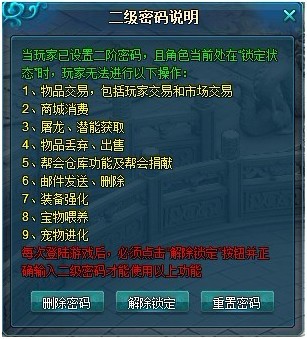 设置好密码后,玩家再次上线,帐号处于锁定状态,需要解除锁定才能进行一系列操作: