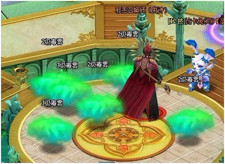 1、BOSS进入战斗状态后,每隔一段时间会在自身周围随机召唤1级毒雾,处于毒雾附近的玩家将收到伤害