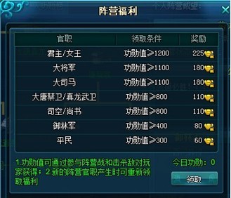 (1)福利领取,不同官职领取的福利不同,功勋值达到一定数值才能领取福利。