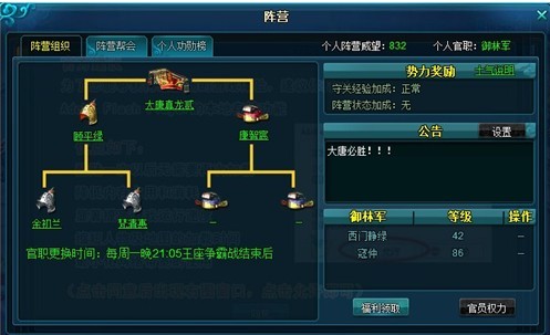 阵营官职每周一21:05王座争霸战结束后更新,以当日21:05的功勋值为准,点击阵营或者士气条可以查看阵营官职等。官职更新后,此前未行使的特权与福利作废。