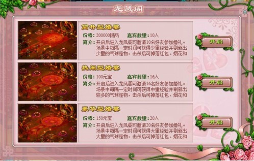 结婚后男方获得道具【新婚证明】,双击开启并进入【龙凤阁】,场景中每隔一定时间刷新出少量的爱心乞求,击杀后可掉落红包和喜糖