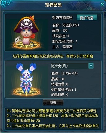 玩家也可以进行一个人繁殖,玩家在npc处提供自己的宠物,系统将会为你匹配一个可繁殖的同类型宠物进行繁殖。玩家可以通过消耗不同数量的元宝,自己选择繁殖的二代宠物的品质和技能数量。