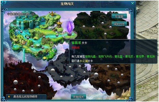 4、每天每位玩家可以进行10次闯关,闯关获得的奖励将放入珍宝阁,珍宝阁容量有限,请及时取出道具,容量满后将不会获得宠物闯关的道具奖励