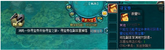 鼠标放到探索标志上可以看到,寻宝需求的物品是寻宝券,(寻宝券是可以由副本深渊地穴掉落的,这东西地球人都应该知道了吧!!!!)寻宝的大致流程是:点击【探索】图标后,按照显示出来的箭头指示,走向某个方向一定距离到达宝物所在范围内之后,点击【探索】即可获得天降宝物!