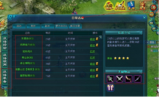 大唐真龙2中的武器来源主要来自于游戏中的副本,在游戏右上角的【活】选项中可点开【日常活动】界面,再选择左侧栏的【获得装备】选项即可查看到可获得武器装备的副本信息,较为方便的让玩家了解武器装备获得信息的设置:
