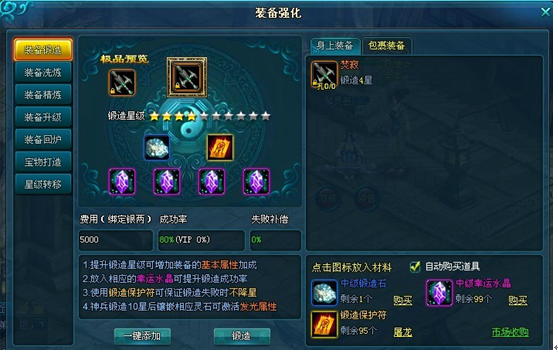 装备锻造需要消耗道具锻造石头,装备4星以后可加入幸运水晶来提升锻造的成功率,锻造保护符保证锻造失败时不会掉落星级;