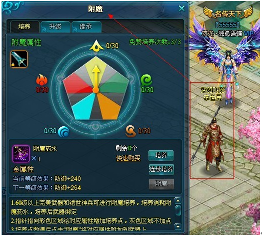 附魔可在洛阳【武器附魔李世民】处打开该功能,附魔系统分别拥有培养、升级、继承,培养主要针对的是单项五行属性的提升,升级主要针对整体附魔属性的提升;