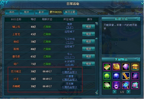 野外BOSS一直以来都是大唐真龙2中兵家必争的焦点,更有“得BOSS者得天下!”的说法,毕竟BOSS的道具产出丰厚而珍贵,为了让玩家更好的获得珍贵道具,大唐真龙2推出了新的BOSS类型,BOSS系统保留了原有的野外BOSS之外,新增随机坐标BOSS,让队友给力、给力、再给力吧,珍稀宝藏等待着实力非凡的勇者到来!