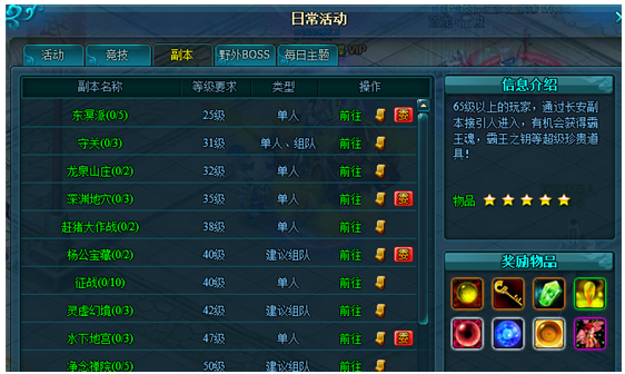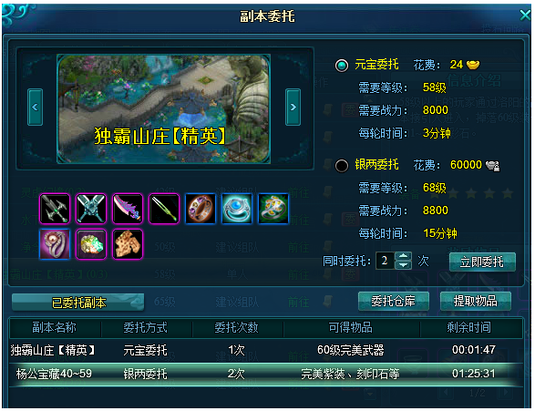 银两委托:副本委托完成时间较长,等级以及战力要求较高,获得的道具均为绑定。