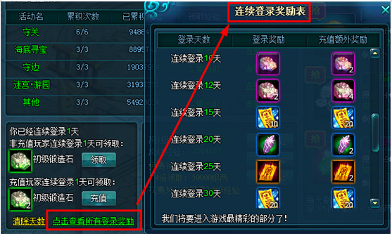 玩家连续登陆累积天数,可获得极其丰厚的奖励,更有锻造保护符、五彩石、屠龙符、攻击石、防御石等珍稀道具奖励。
