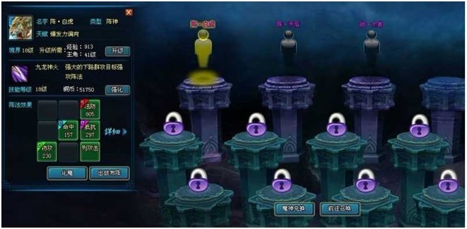 前期有个好点的战魔神是必不可少的,用铜币可以有几率招到蓝色的魔神,不过建议非RMB不要在此浪费太多的铜钱,因为就算是用20元宝招也很难招到紫色魔神,因此建议同志们招个**的魔神就可以了,为什么招**的,因为这个游戏里面大部分都是物理怪,所以**魔神打起来比较痛。RMB选手呢就可以充个V2 3 4用紫宵阵招紫色的魔神,出紫色的几率还是比较高的。如果你想要极品魔神例如战天空 阵白虎 阵天空 阵朱雀这些的话,请你做好用碎片换的准备把,= =不是人人都能像我200元宝出阵白虎的,嘿嘿~