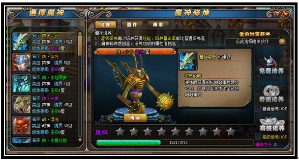 那应该这样提升培养等级呢?我们可以通过【培养界面】右方的【培养选项】对魔神进行普通培养或高级培养,魔神经过培养后就可以获得【培养经验】,当【魔神培养经验槽】蓄满后,就可以获得一颗星,当积满9颗星就可以提升一级魔神修炼等级。