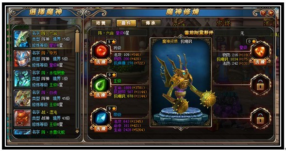 当大家达到43级,就可以开启【魔神修炼系统】。点击相应的图标就可以进入【魔神修炼页面】,进入页面后,大家可以看到该页面左边会显示您当前所拥有的魔神,选择其中一个就可以进行培养、附灵、传承。
