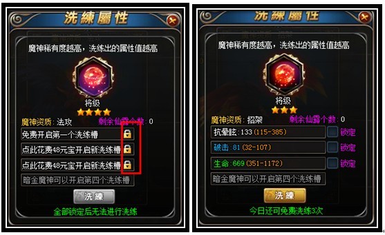 除暗金魔神外每个魔神只能开启3个【属性洗练槽】,而暗金魔神则可以拥有4个【属性洗练槽】,大家可以通过点击洗练槽消耗一定元宝开启。