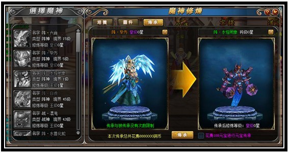 最后我们来讲一下【魔神传承】,当获得了新魔神,此时您只要进行【魔神传承】,那之前已经培养过的魔神,就会将对应的【魔神培养经验】传承到新魔神上,这样新的魔神就可以迅速提升【魔神修炼等级】。这里大圣偷偷告诉大家,铜币传承和元宝传承的效果是一样的,都是100%传承所有培养经验哦,大家可以自由选择自己喜欢的传承方式~