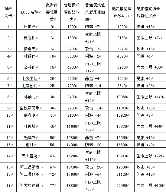 每个BOSS第一次暴走模式的击杀(通过每个BOSS第一次挑战)增加一定属性。以后重复挑战饿不再加属性。