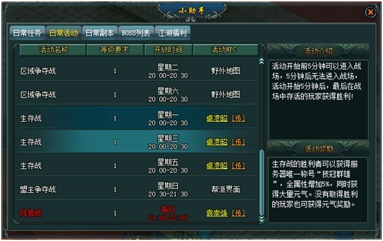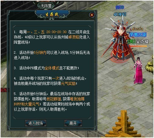 1、每周一、三、五 20:00-20:30开启生存战,40级以上玩家可以从扬州卓凌昭处进入战场。
