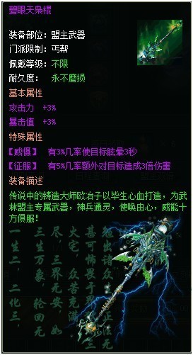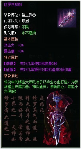 1、 专属武器,每周盟主争夺战前系统将会暂时收回上一届武林盟主的专属武器;