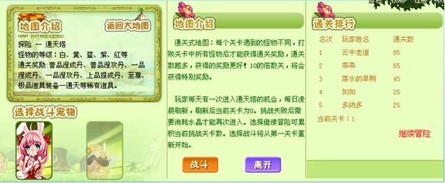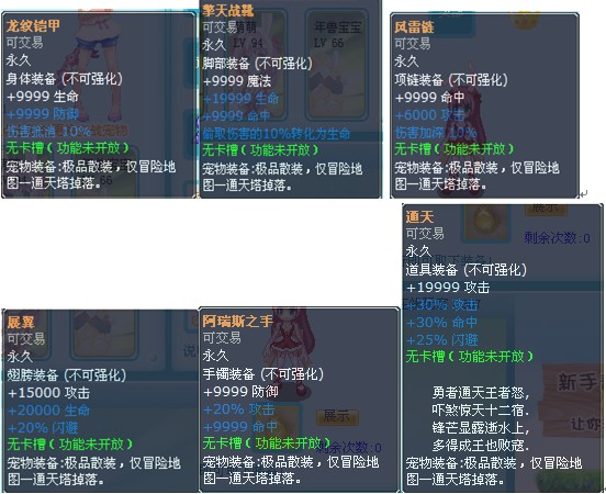 通天塔?勇者通天,是勇气的王者还是神秘的探险家?在这里又降埋葬怎样的宝藏?极品装备、稀有道具、一切都是那么的不可思议!当新大陆的地图出现伟岸的天梯,当“通天塔”三个字屹立于魔城之上,这是不是预示着另一个时代的到来,充斥着冒险与挑战,无比耀眼、无比炫丽!现在就是揭秘奇迹的时刻!!通天塔地图介绍:
