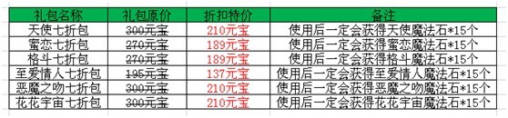 活动内容:活动更新后,神秘商店将上架六款广受玩家们喜爱的7折扣包(至爱情人、蜜恋、花花宇宙、天使、恶魔之吻、格斗),开启折扣包后将会获得15个对应的神秘商店魔法石,所有折扣包全部限时7天7折销售中~~!
