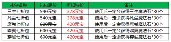 活动内容:活动更新后,神秘商店将上架五款广受玩家们喜爱的7折包(三生七折包、凡尘七折包、席卷七折包、暗翼七折包、穿越七折包),开启折扣包后将会获得30个对应的神秘商店魔法石,所有折扣包全部限时7天7折销售中~~!