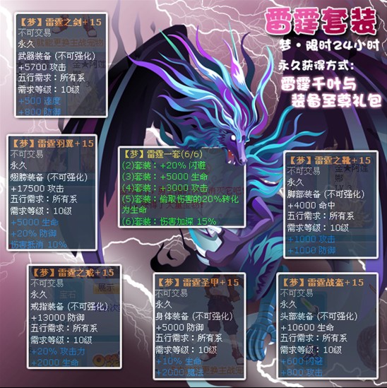 【梦】雷霆套装+15属性如下(限时装备强化效果已经直接添加,故显示为不可强化)