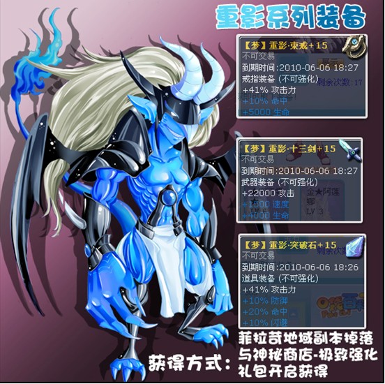 【梦】重影系列获取方式:神秘商店购买10元宝的梦游体验卷(不可交易)后,前往【铁匠铺】领取,每个角色只能够领取一次。(限时3天,如果想要拥有永久重影系列效果,可以在【神秘商店】购买极致强化礼包获得):永久的重影系列装备获得后,可以在神秘商店使用水晶购买重影·幻石到铁匠铺进行强化,11级以后推荐使用强化保等石进行强化,否则将可能导致强化失败物品消失!