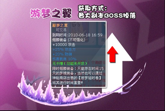 游梦之翼道具介绍:(可交易)为期15天的限时翅膀装备,其品质可见非常强大,当然如果看到时间到了又舍不得的话,不妨使用游梦延时卷让其时间重置回归到初始的15天哦,同时因为绝版装备兼可交易,所以升值空间也是非常大的哦。