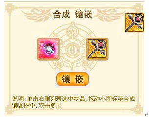 进入中心城镇-铁匠铺-合成镶嵌界面,单击选中右侧列表中水晶物品和装备物品,将界面右上角的水晶图标和装备图标分别拖入界面两个方框中,再单击镶嵌按钮即可,如图显示: