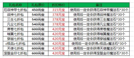 活动内容:活动更新后,神秘商店将上架十款广受玩家们喜爱的7折扣包(三生、凡尘、暗翼、席卷、穿越、战神、涅槃金印、厄菲神甲、天使、≮极品≯),开启折扣包后将会获得30个对应的神秘商店魔法石,所有折扣包全部限时7折销售中~~!