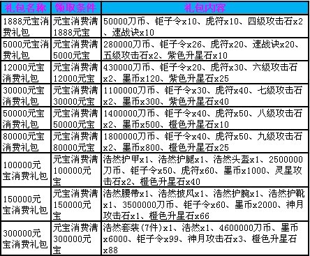 活动内容:活动期间,玩家消费元宝达到指定额度即可领取相应的礼包奖励!