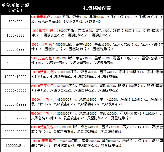 活动内容: 活动期间单笔充值达到指定额度即可获得相应的礼包一份