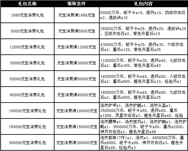 活动内容:活动期间,玩家消费元宝达到指定额度即可领取相应的礼包奖励!