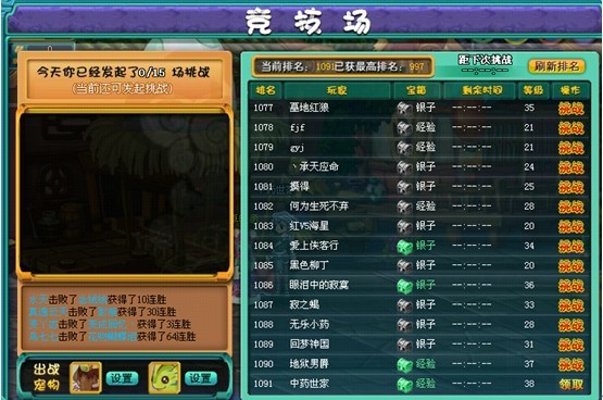 每天的任意时间段,通过在功能快捷键“竞技”中挑战其他玩家。挑战胜利后可以获得银两、礼券、经验等奖励,同时每天竞技场排名前10名玩家还将获得更加丰厚的奖励!前10名奖励系统会在每天的22:00进行统计,并以邮件的形式直接发放奖励!