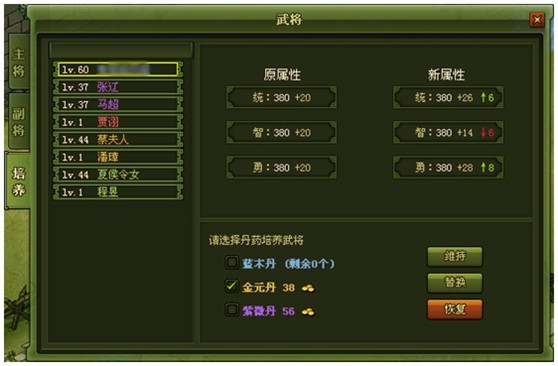 勾选你想使用的丹药,点击服用,新属性处会显示本次培养后的三围属性。
