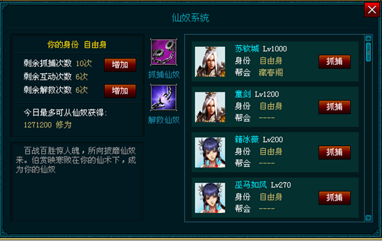 黑狱和竞技场是密不可分的,为什么这么说呢?因为你必须经过竞技场的战斗,才可以在黑狱中抓捕仙奴获取经验。进入黑狱之后,你会在右侧找到抓捕列表,这个列表里的名单为你竞技场的手下败将,当然这是自由身和地主时的情况,如果你不幸被抓成为别人的仙奴,那么就先想办法逃离魔掌吧。
