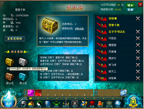 游戏中期,竞技场成了玩家**展示自身实力的地方。玩家还可在每天特定的时间领取相应名次相应级别的宝箱,包括材料宝箱、竞技场声望以及晶币。而竞技场声望又可以换取不同的称号来获得属性的加成,所以竞技场的竞争会非常激烈。