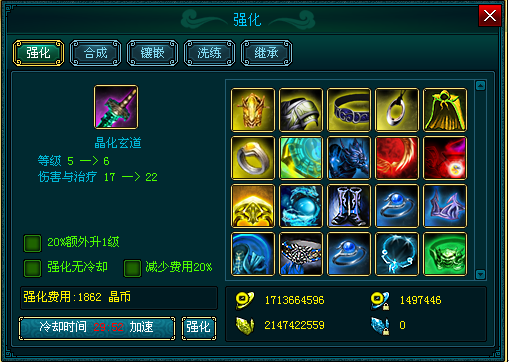 系统还有3种特殊强化方式,只不过需要额外花费一定数量的仙石。前期在装备相当的情况下,挑战时特别是竞技场中,装备高强化的优势就会体现出来,所以应当合理利用这3中特殊强化。20%额外升1级,意思就是点击强化时有20%几率会让你的装备额外升1级,事半功倍就是这个道理,这个纯属运气活,我在强化时最高出现过连续3次双倍,后悔当天没买**……强化无冷却,即在强化时可以无视冷却时间,只要晶币足够,就可以连续强化,直到等级上限;减少费用20%,这种特殊强化方式适合高强化装备,强化越高的装备再次强化需要花费的晶币会越高,这个时候20%的费用减少会让你省下更多的晶币来做别的事情,后期推荐使用此强化方法。