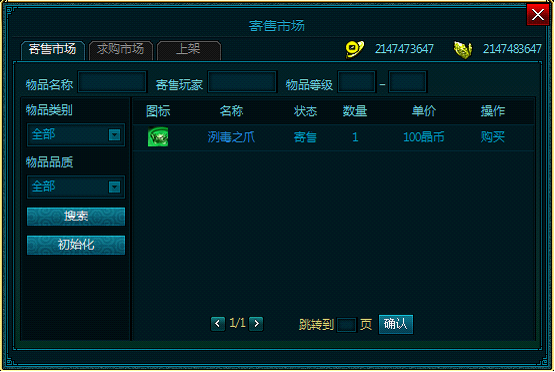 寄售市场显示市场上已寄售的物品基本信息,点击购买按钮进行购买。