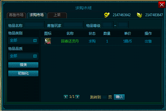 求购市场:显示所有求购物品。点击出售卖出物品获得相应所偿。